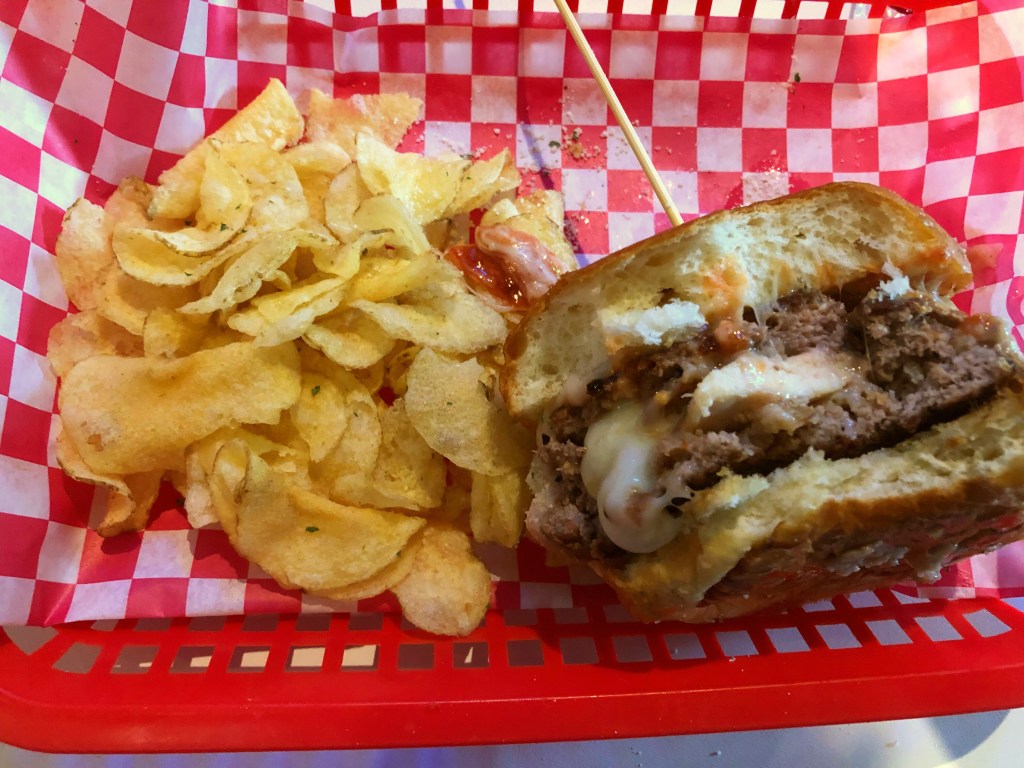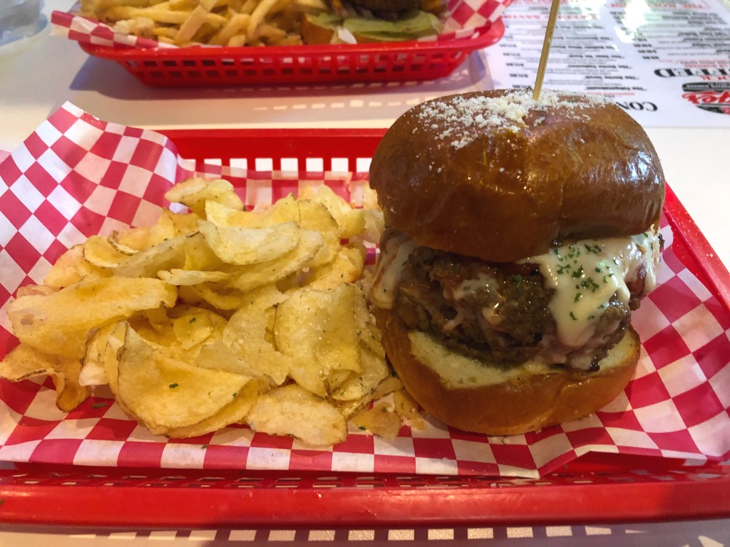 This burger, no…this legend is a half-pound burger stuffed with a chicken cutlet, with Parmesan cheese, Mozzarella cheese, sauce, more Mozzerella, and a sprinkle of Parm on top of the brioche bun. It legitimately sounds like Little Italy Pine Avenue shoved into a burger.